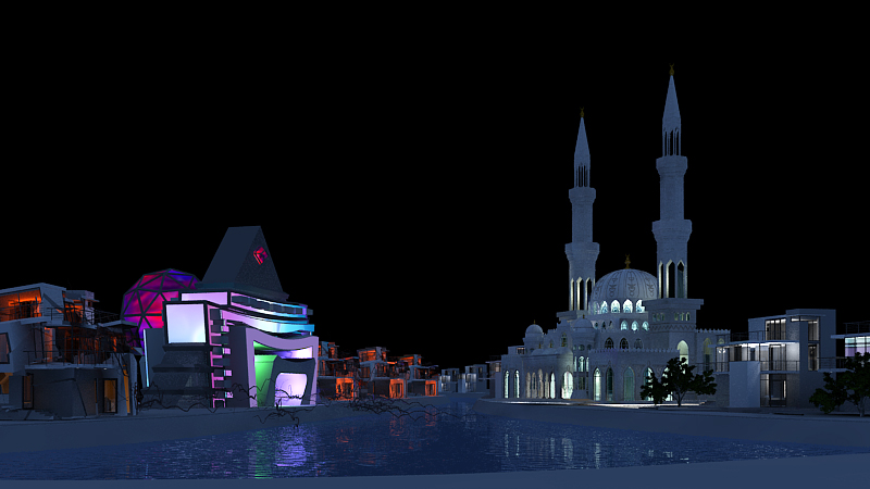 مزيد من التطور في العمل يوضح الملهى اليلي الذي حاولت وضع افكار مختلفه لإيضاح هيكله الشر وايضا بعض التأثيرات ببلاجين ivy لماحاكاه إنتشاره من الملهى إلى ماحوله وإنتشار الفساد والدمار وفي الناحيه المقابله سوف اضع المسجد الذي يوضح فكره الخير وتأثيره على ماحوله وحمايته لما حوله من ايدي الشر الخفيه .... وفقكم الله جميعا وشكرا للمتابعه