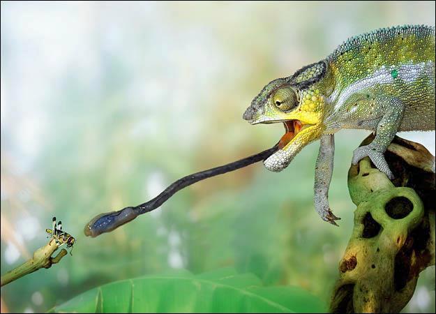 تحصل الحرباء على طعامها من خلال إبراز قذف ألسنتها الطويلة من أفواههم لالتقاط فريسة تقع على مسافة بعيدة. ويصل لسان الحرباء هذا الى 1،5-2 أضعاف طول الجسم (طولها باستثناء الذيل)، فقد اكتشف مؤخرا أن الحرباء الصغيرة يكون لديها أجهزة اللسان أكبر نسبيا من نظيراتها الأكبر حجما
